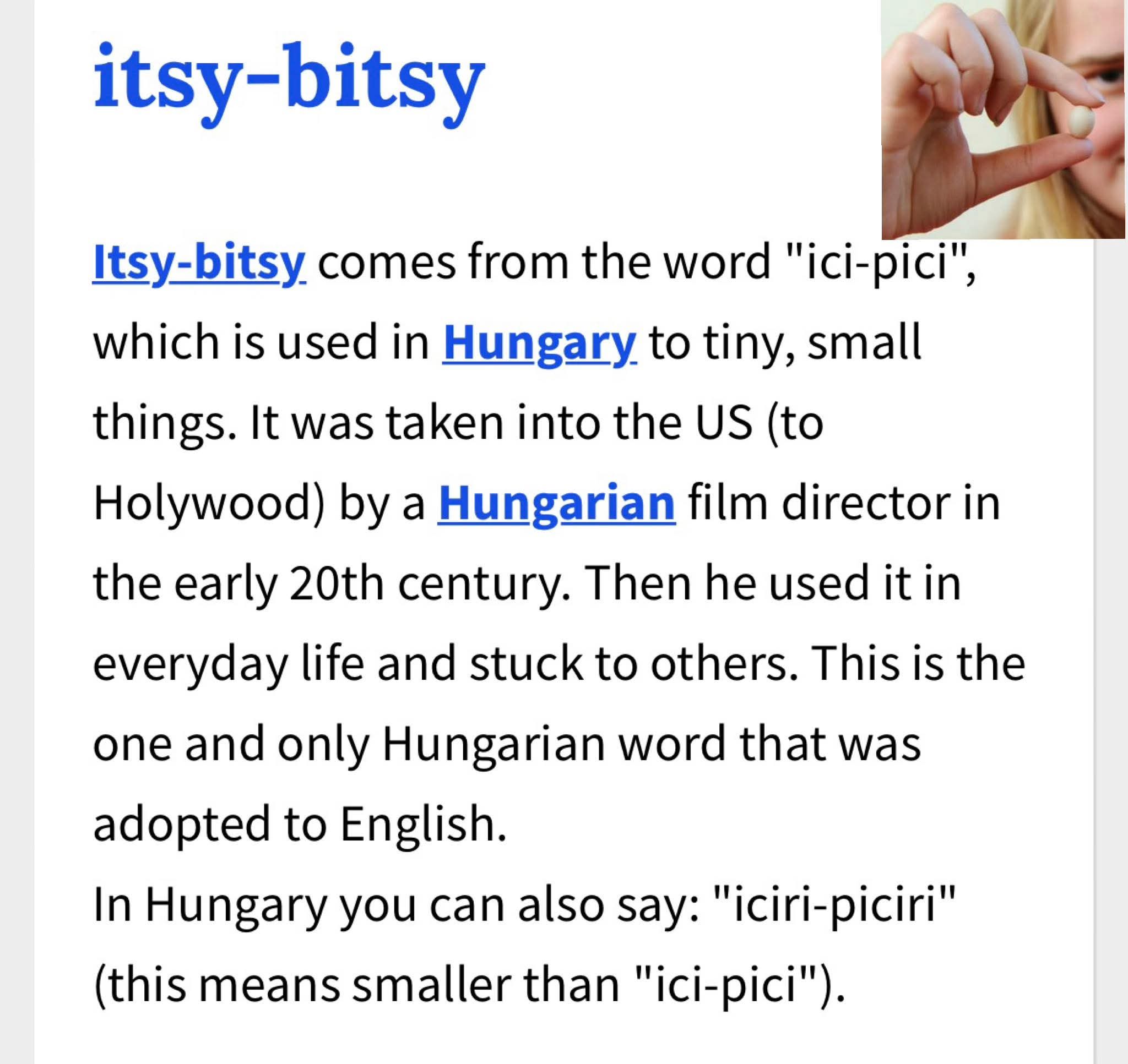 But did you know, that some Hungarian words got into the English, as well? As itsy-bitsy? In the Brian Hyland hit from the ’60s: https://www.youtube.com/watch?v=ICkWjdQuK7Q. Here you can find the origin of this expression.